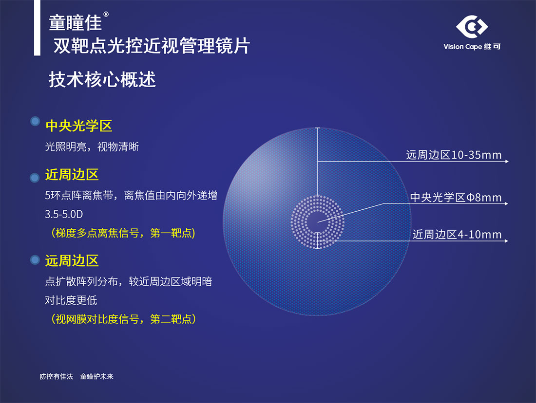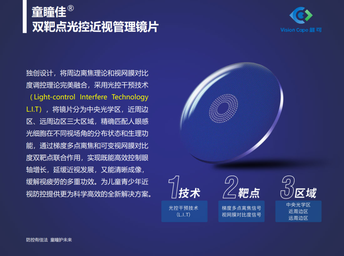 当无数家长还在为孩子不断增长的近视度数焦虑,当传统镜片只能 “矫正视力” 却无法“阻止进展”,Vision Cape 维可医疗耗时 3 年研发,融合“周边离焦理论”与“视网膜对比度调控理论”两大近视防控核心理论,带来真正的黑科技产品——童瞳佳双靶点光控近视管理镜片,以双靶点协同作用打破传统近视防控局限,为儿童青少年近视管理带来全新解决方案。