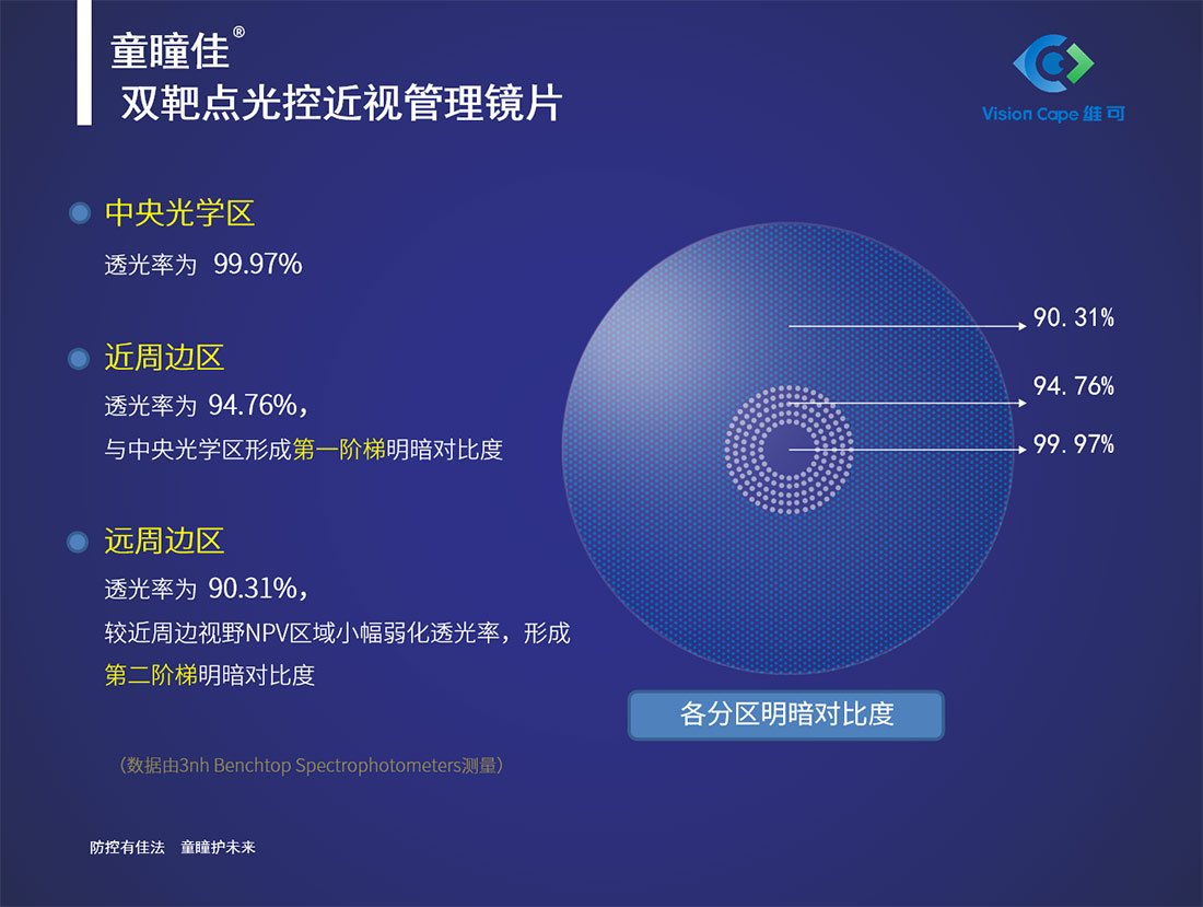 匹配视网膜近周边视杆细胞急剧增加的生理特点,除 5 环梯度离焦带外,还通过 94.76% 的透光率与中央区形成第一阶梯明暗对比。这一设计既通过离焦信号控轴,又贴合近周边区域对“较弱光照”的需求,减少强光刺激引发的视疲劳。
