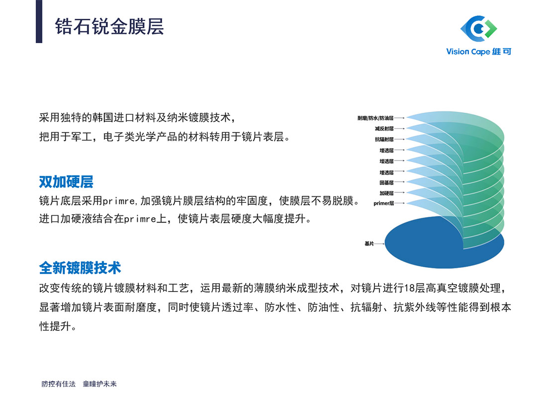 镜片表层采用韩国进口材料与纳米镀膜技术,打造“锆石锐金”专属膜层,从军工、电子光学领域跨界应用优质材料,实现多重防护。